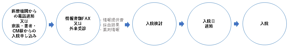ベッド調整し、入院日が決定しましたら入院中の医療相談員等または施設の相談員等を通じて入院日をお伝えします。