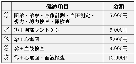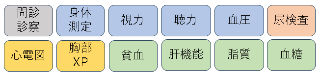 (問診/診察・身長・体重・腹囲・視力・聴力・尿検査・心電図・胸部XP・貧血・肝機能・脂質・血糖)