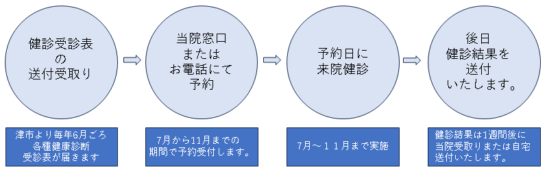 津市からの案内を確認し、受診券を使って当院受付窓口または当院に電話予約してください。(津市より6月下旬に受診券が送付されます。5月から7月に75歳になる方は8月中旬、8月に75歳になる方は9月中旬に送付されます。)
