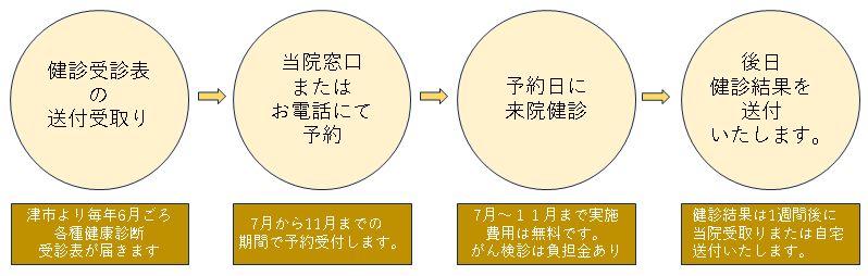津市からの案内を確認し、受診券を使って当院に電話予約してください。(津市より6月下旬に受診券が送付されます。5月から7月に75歳になる方は8月中旬、8月に75歳になる方は9月中旬に送付されます。)
